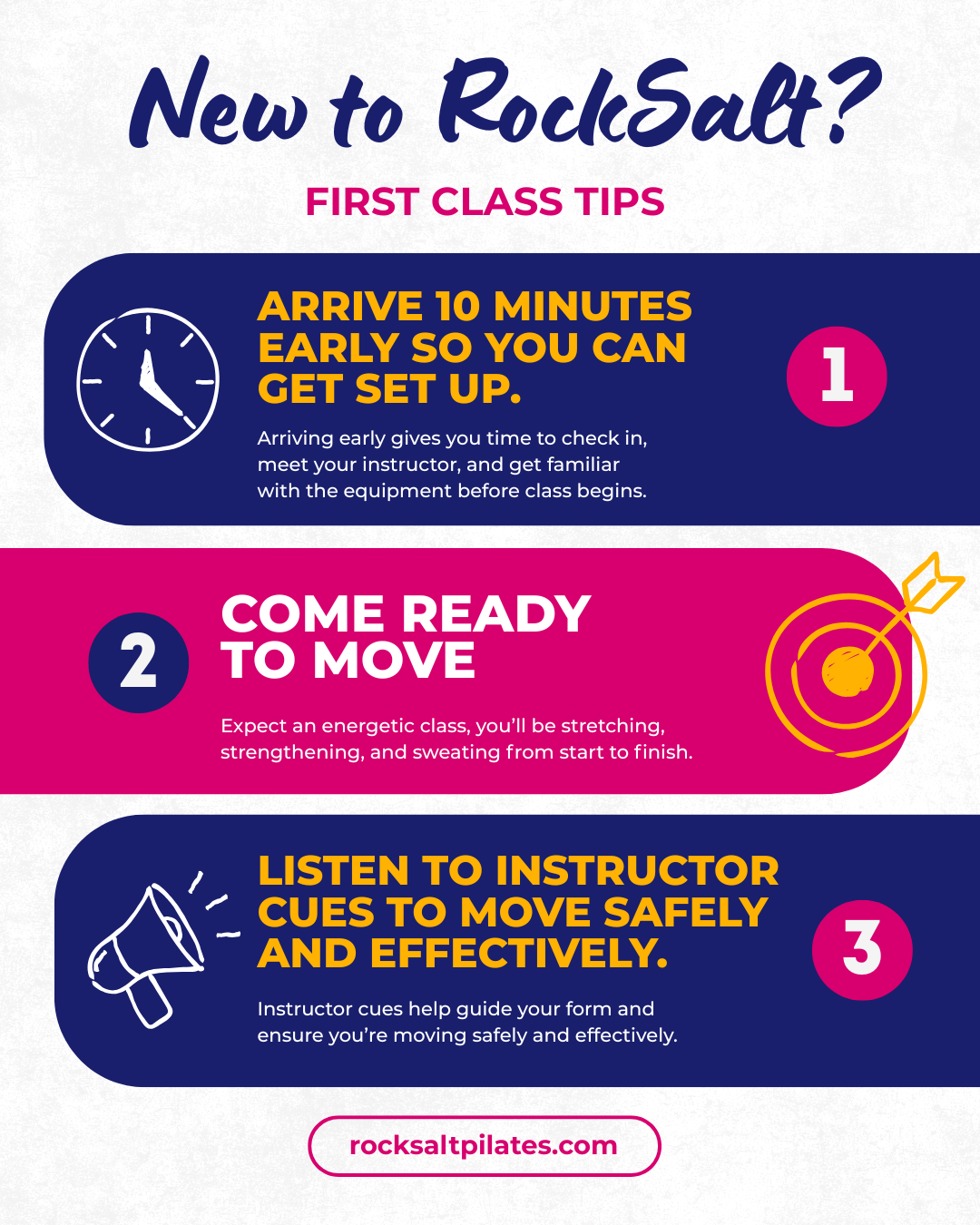 • Come ready to move - Expect an energetic class, you’ll be stretching, strengthening, and sweating from start to finish.